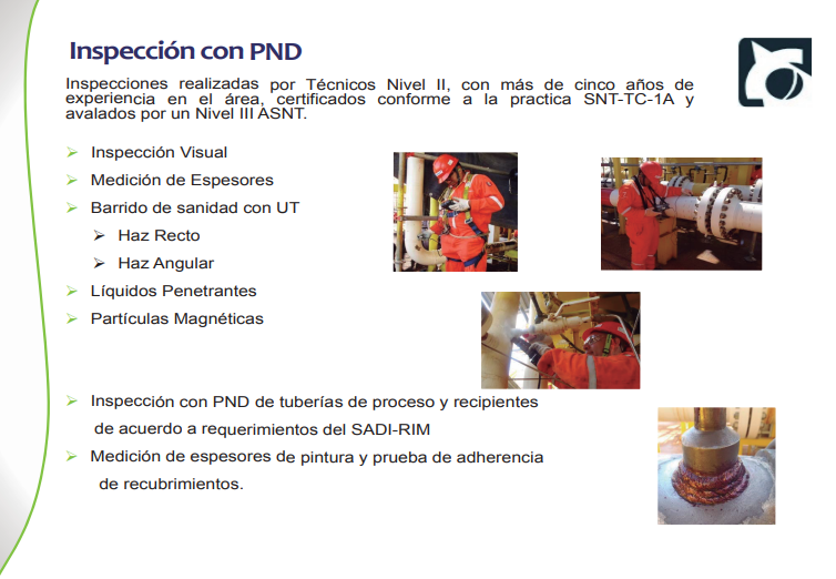 Inspecciones realizadas por técnicos nivel II, con más de cinco años de experiencia en el área, certificados conforme a la práctica SNT-TC-1A y avalados por un nivel III ASNT.