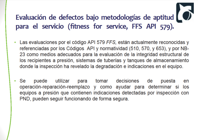 Las evaluaciones por el código API 579 FFS, están actualmente reconocidas y referenciadas por los Códigos API y normatividad (510,570, y 653), y por NB-23 como medios adecuados para la evaluación de la integridad.