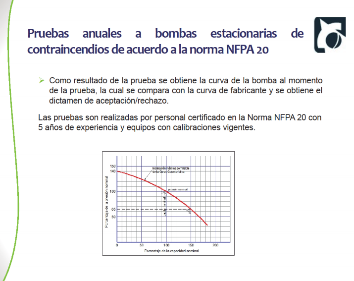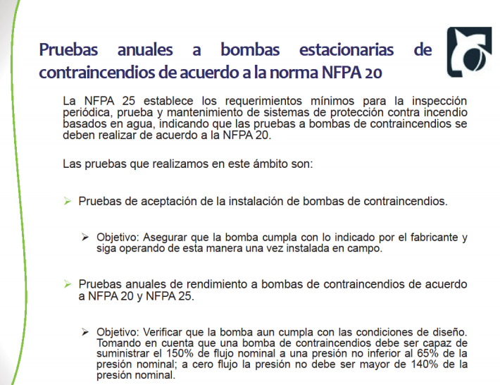 La NFPA 25 establece los requerimientos mínimos para la inspección periódica, prueba y mantenimiento de sistemas de protección contra incendio basados en agua, indicando que las pruebas a bombas de contraincendios se deben realizar de acuerdo a la NFPA 20.