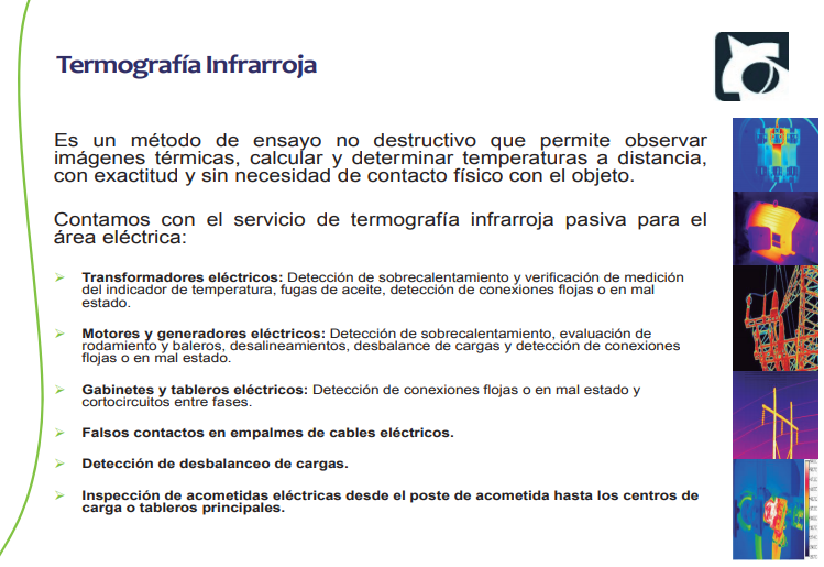 Es un método de ensayo no destructivo que permite observar imágenes térmicas, calcular y determinar temperaturas a distancia, con exactitud y sin necesidad de contacto físico con el objeto. Contamos con el servicio de termografía infrarroja pasiva para el área eléctrica.